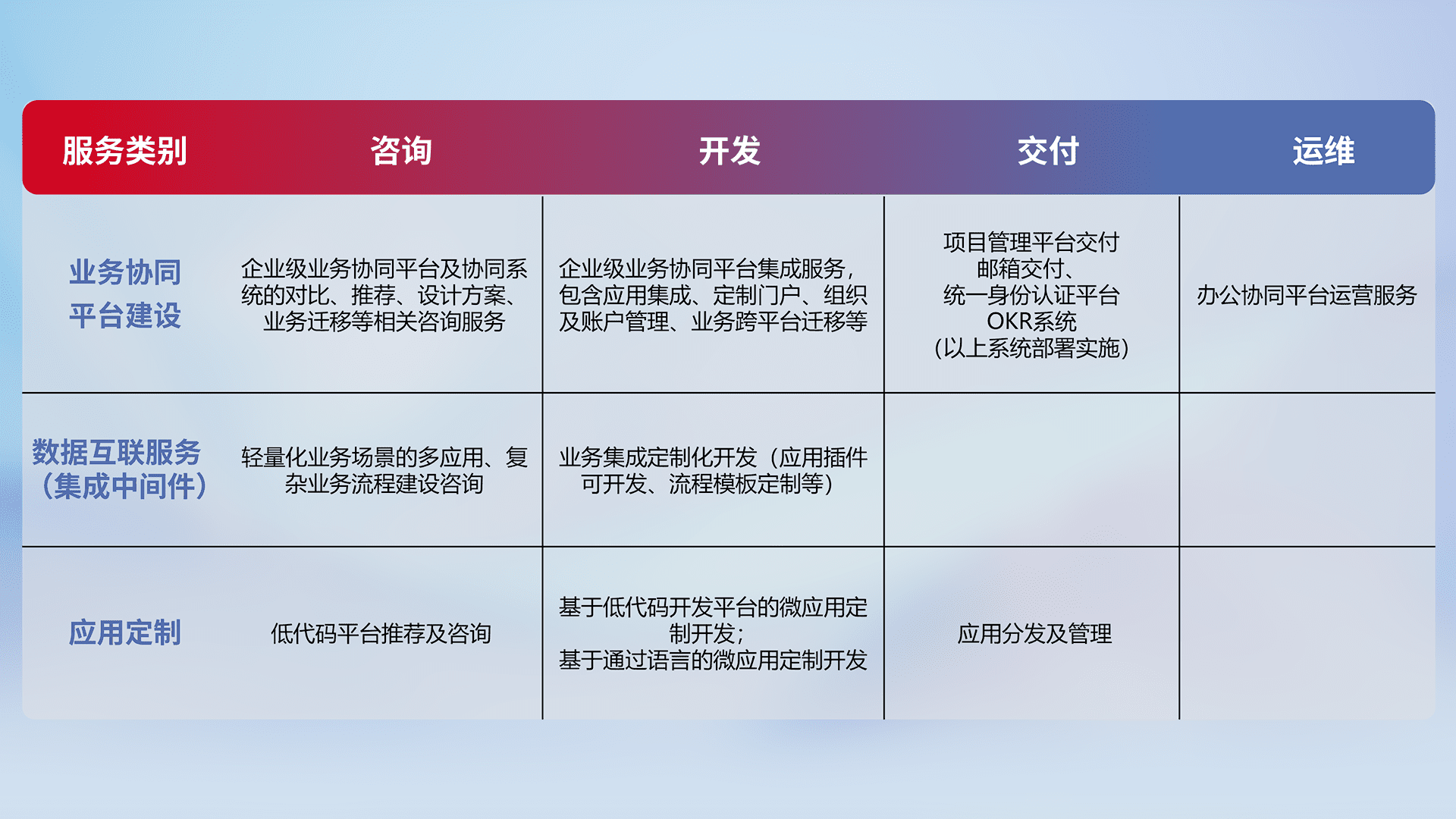 针对钉钉、、企微、、、、IDaas等平台级产品提供产品的规划、、方案、、交付、、、、定制化开发等服务,,,,实现如统一协同办公、、智能客户服务、、混合会议管理、、、智能数据查询、、等业务场景,,实现数字化转型。。。